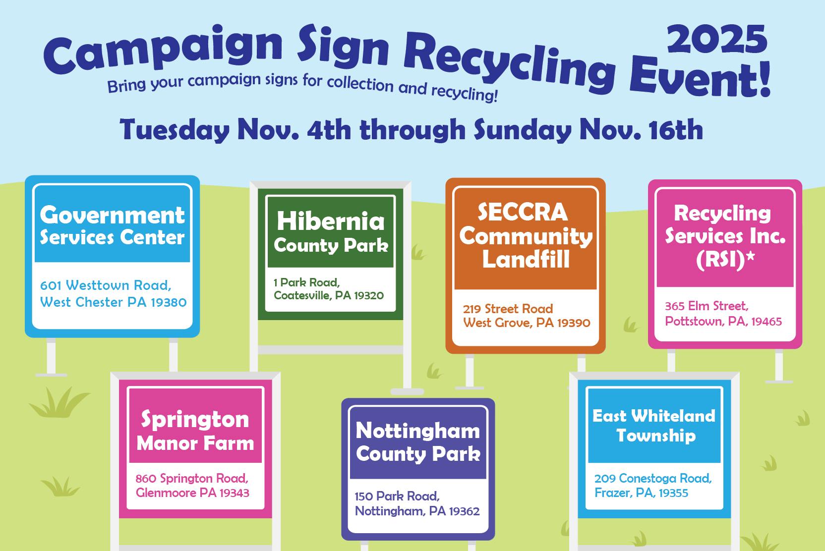 Chester County Voter Services has set up multiple, daytime, drop off locations to recycle election yard signs!